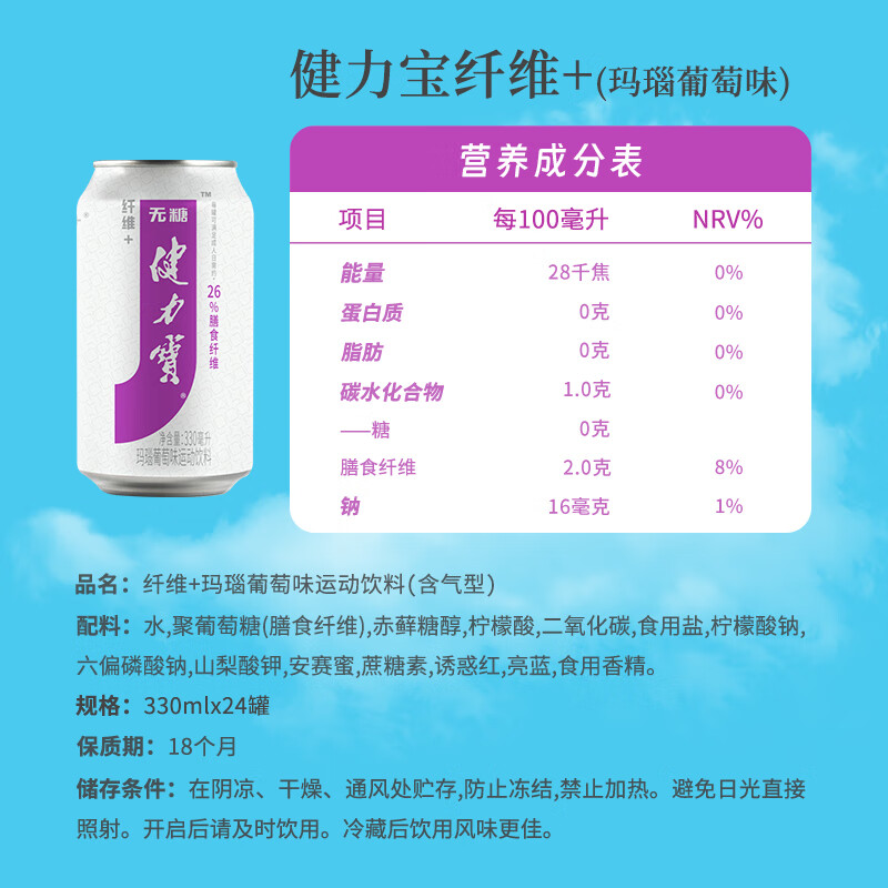 健力宝无糖0糖0脂含膳食纤维+葡萄味330ml*24罐补充电解质运动饮料汽水