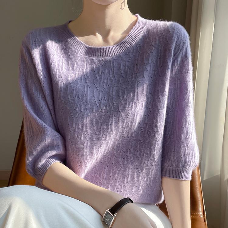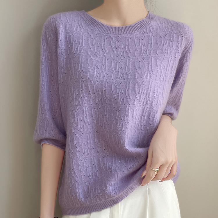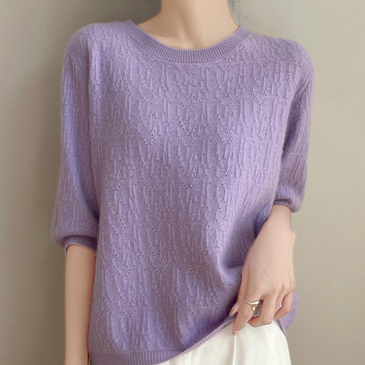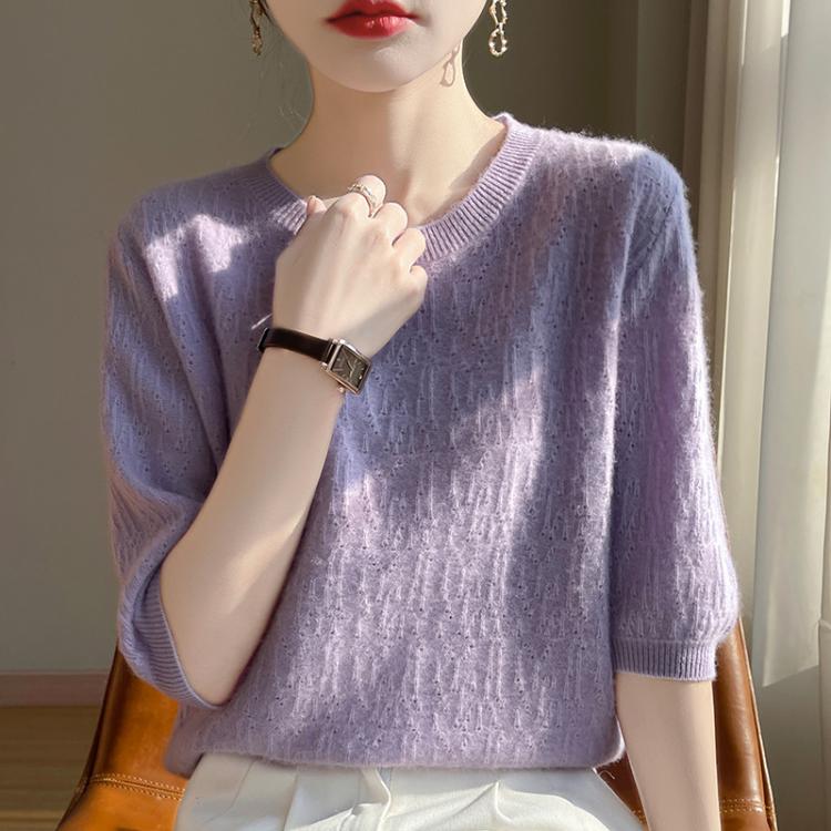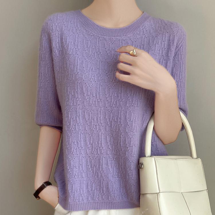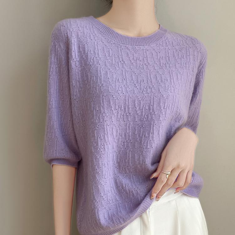 猫人 圆领短袖不规则提花镂空针织衫女修身显瘦百搭上衣通勤日常外穿