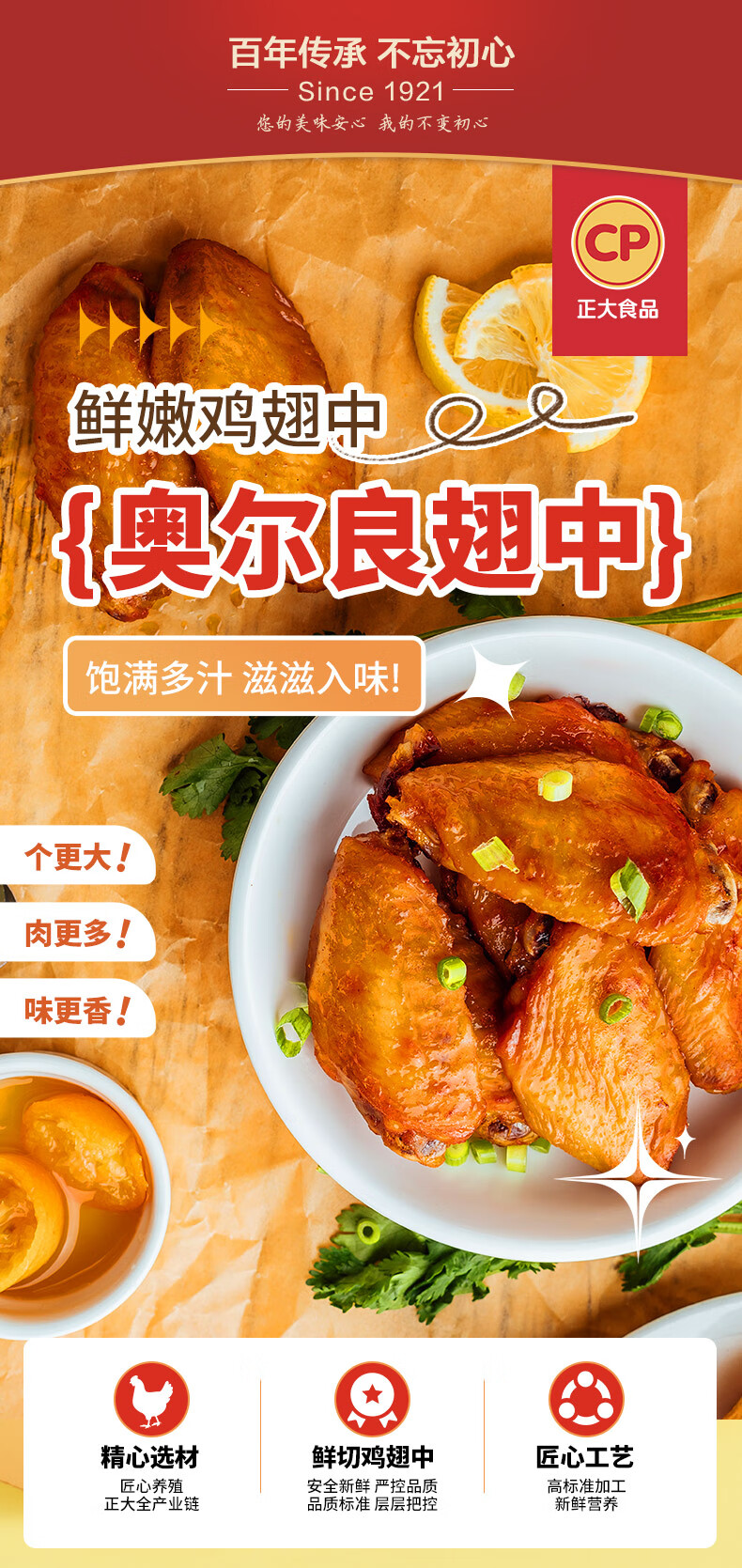 CP正大食品 奥尔良鸡翅中净重2斤 鸡翅奥尔良风味 鸡中翅 【在售价】49.80元 【到手价】49.80元 下单链接:https://u.jd.com/06zhxKo
