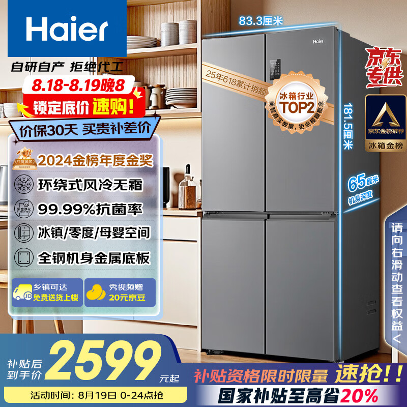 海尔(Haier)465升十字对开四开门电冰箱家用风冷无霜一级能效变频超薄BCD-465WGHTDE9S9家电国家补贴20%