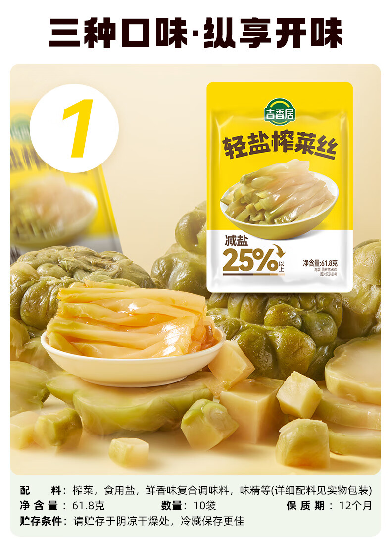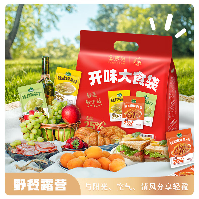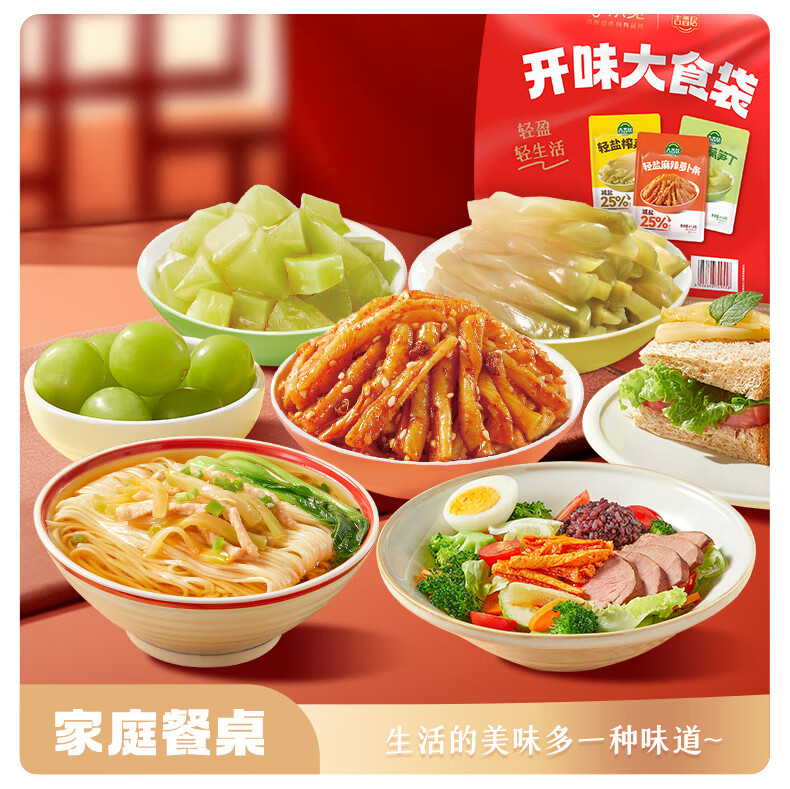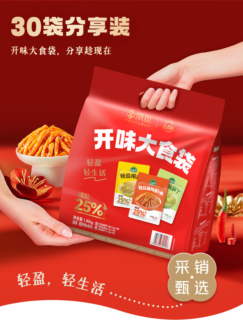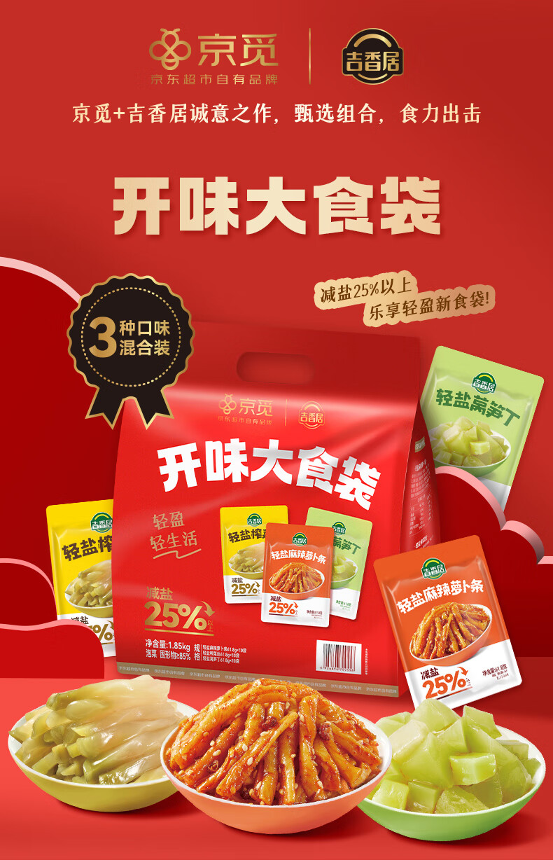 吉香居&京觅 开味大食袋【减盐25%】轻盐榨菜萝卜干莴笋丁61.8g*30 【在售价】29.90元 【到手价】29.90元 下单链接:https://u.jd.com/0OQbd8x