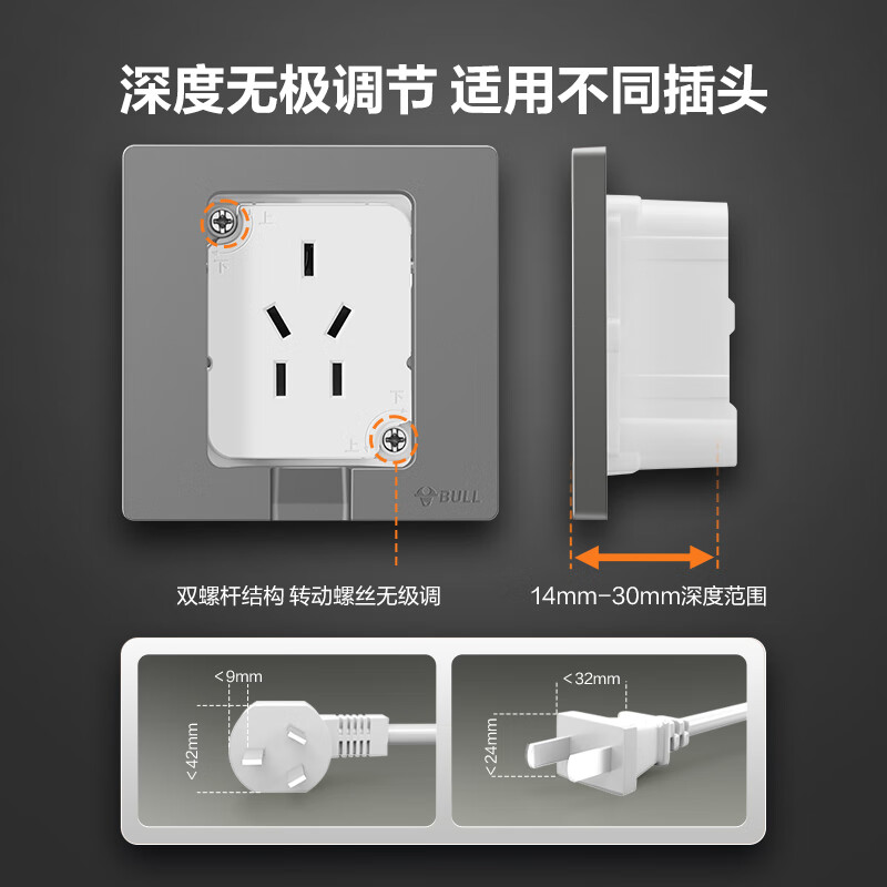 公牛(BULL)开关插座 嵌入式插座可调节空调冰箱隐藏插座GTBZ223灰色五孔10A