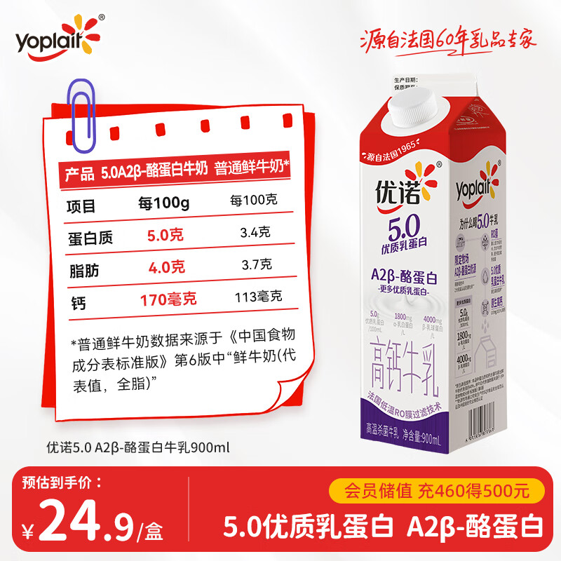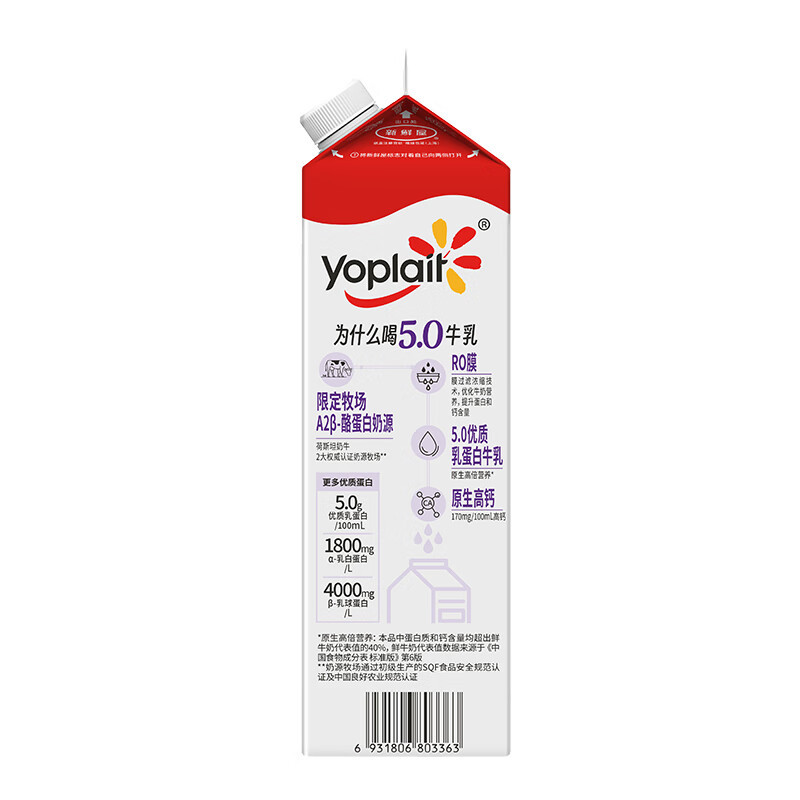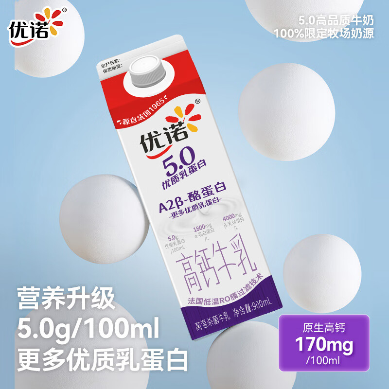 优诺(yoplait)5.0 A2β-酪蛋白牛乳 900ml/盒 优质乳蛋白 低温牛乳牛奶