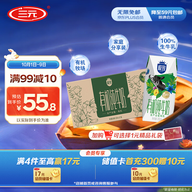 三元极致有机纯牛奶整箱200ml*21盒 有机认证 礼盒装 中秋礼盒 【在售价】55.80元 【到手价】52.80元 下单链接:https://u.jd.com/0O1T4uZ
