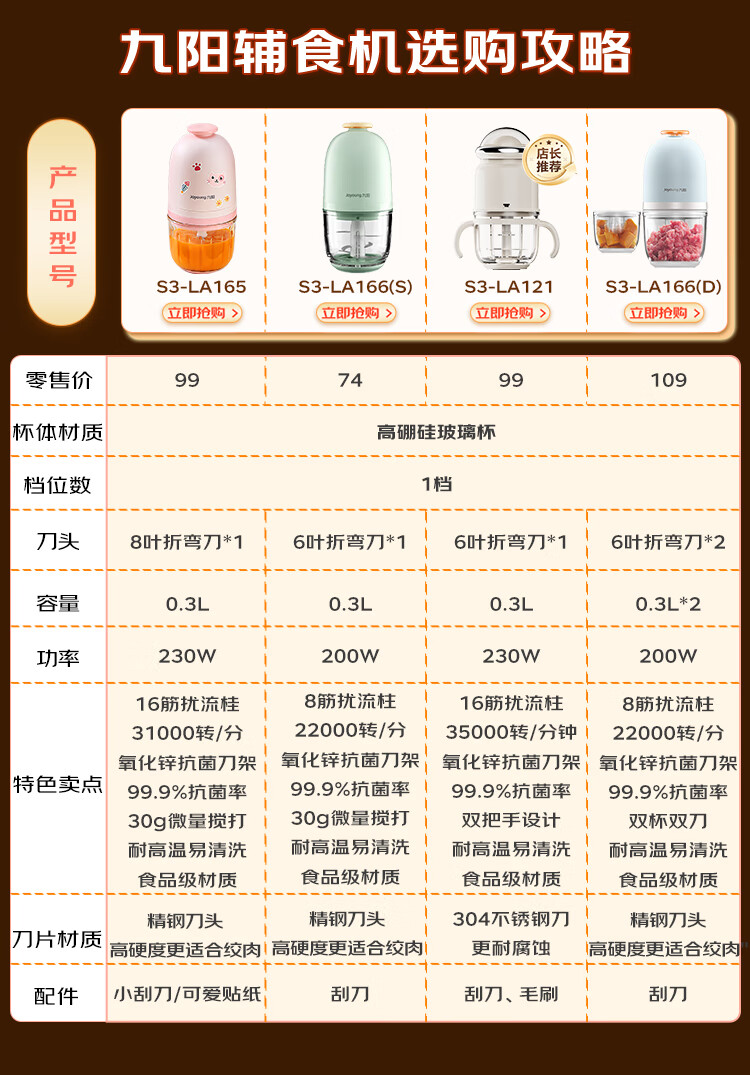 九阳(Joyoung)【政府补贴】婴儿辅食机 小型多功能打泥搅拌机宝宝料理机 绞馅碎肉机高硼硅玻璃S3-LA166(S) 【在售价】74.00元 【到手价】74.00元 下单链接:https://u.jd.com/0OQZOwj