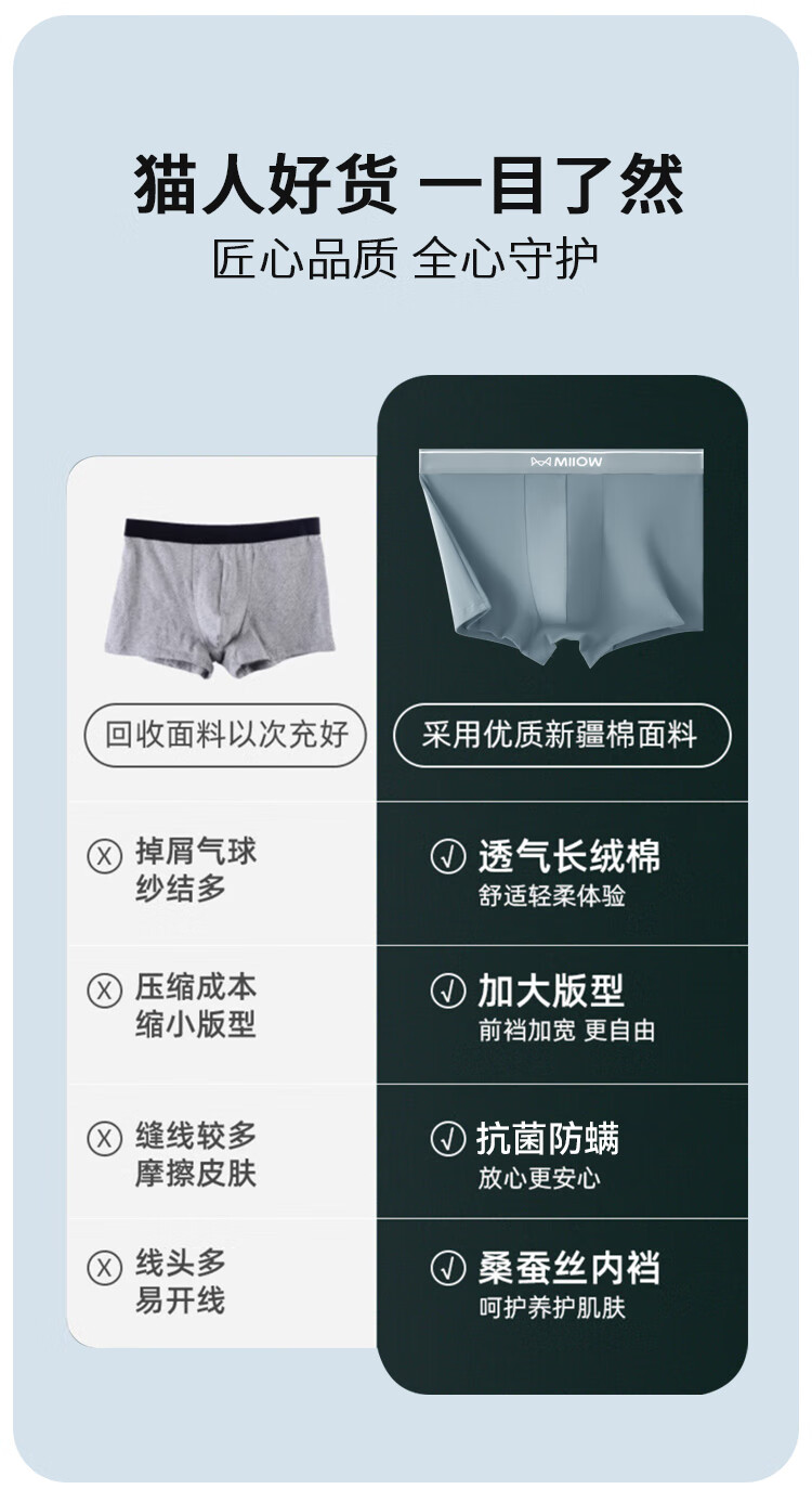 猫人【精梳棉-安心品质】男士内裤男纯棉抗菌蚕丝裆男生四角平角短裤 【在售价】49.90元 【到手价】49.90元 下单链接:https://u.jd.com/0g1oyfv