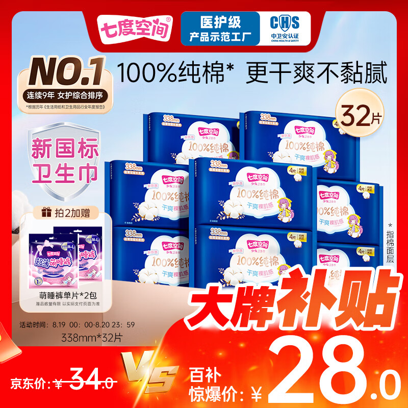 七度空间七度空间少女超薄100%纯棉夜用卫生巾套装32片装 【在售价】28.00元 【到手价】28.00元 下单链接:https://u.jd.com/Y60yKt5
