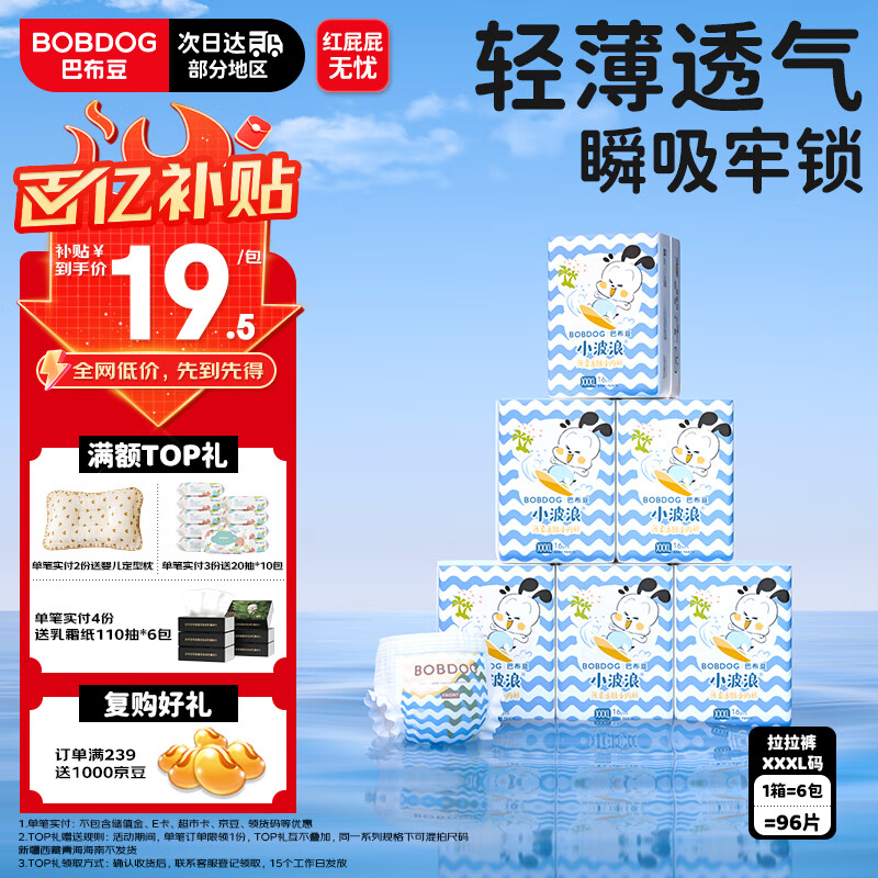 巴布豆(BOBDOG)小波浪薄柔亲肤学步裤XXXL96片箱装(18KG以上)尿不湿 超薄透气