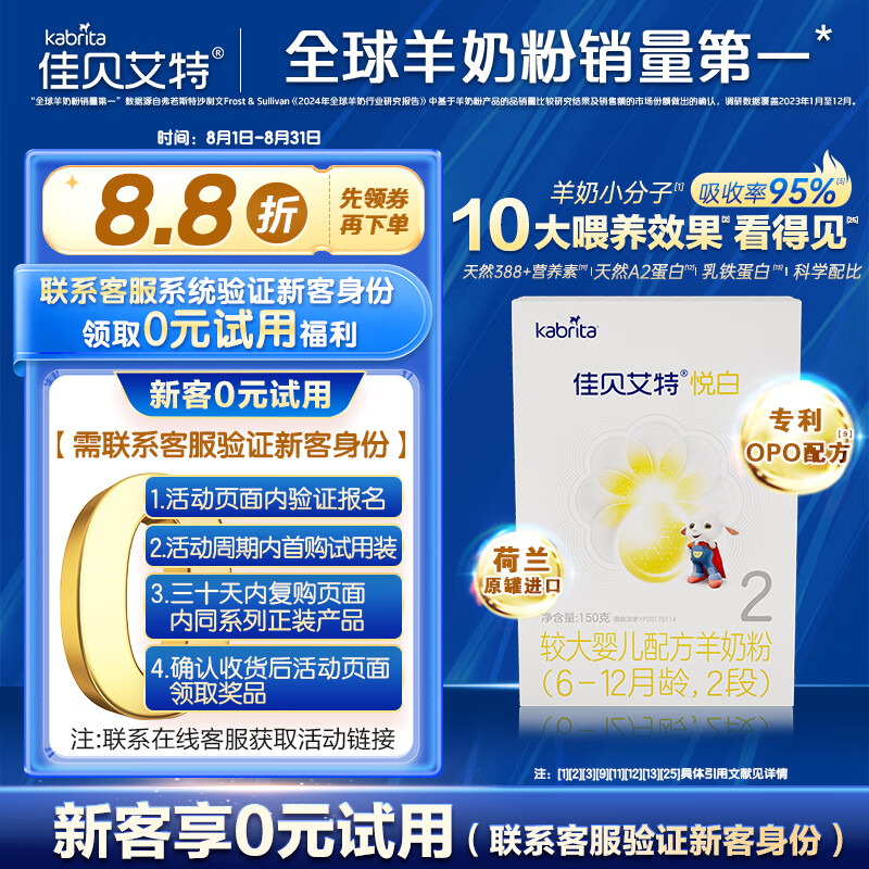 佳贝艾特(Kabrita)悦白较大婴儿配方羊奶粉2段(6-12个月)150克 羊奶小分子 【在售价】29.90元 【到手价】29.90元 下单链接:https://u.jd.com/YG0sXnD