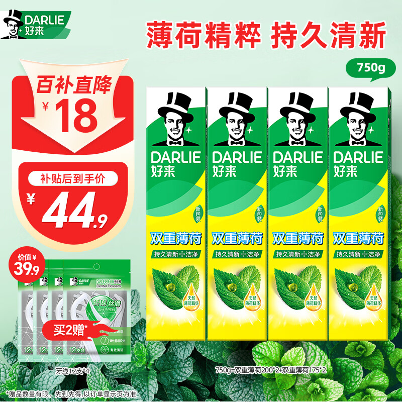 好来(原黑人)热销榜双重薄荷牙膏清新防蛀固齿护龈含氟4支750g 【在售价】44.90元 【到手价】42.90元 下单链接:https://u.jd.com/YrBakNT